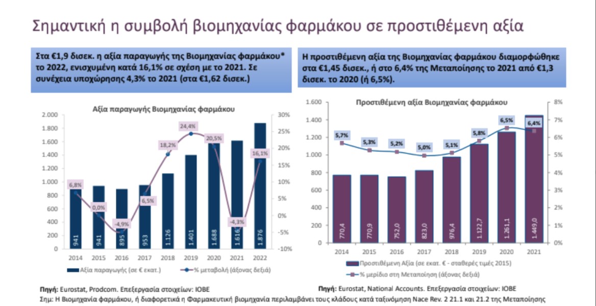Ο κλάδος συνολικά έχει ένα ισχυρό αποτύπωμα στην οικονομία, με πάνω από 6 δισ. ευρώ συνεισφορά στο ΑΕΠ, 2,8% στην συνολική απασχόληση και με αξία παραγωγής που φτάνει τα 1,9 δισ. ευρώ, όπως υπενθυμίζει το ΙΟΒΕ στο δελτίο εξελίξεων για τη βιομηχανία τον Νοέμβριο επικαλούμενο την μελέτη που έχει εκπονήσει για λογαριασμό του Συνδέσμου Φαρμακευτικών Επιχειρήσεων Ελλάδος (ΣΦΕΕ).
