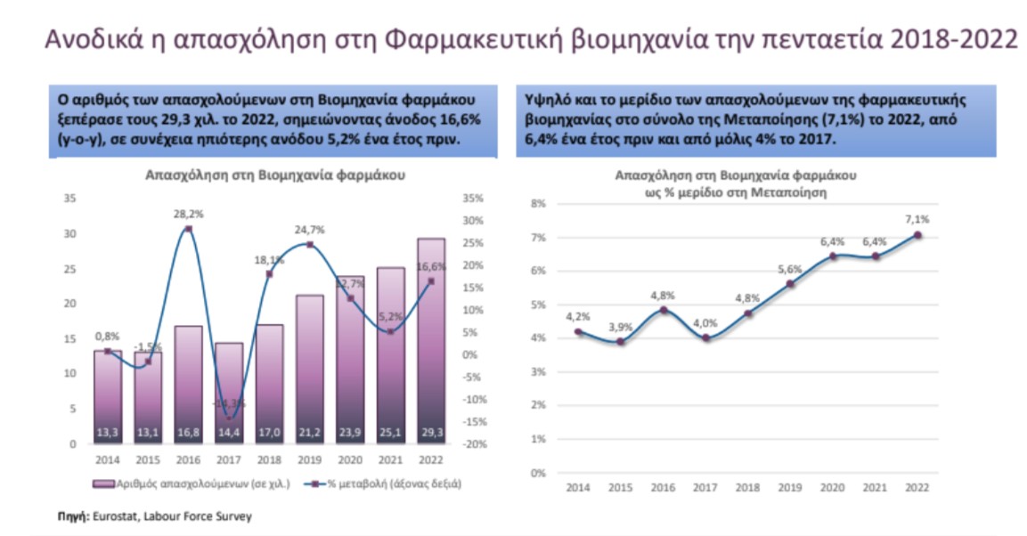 Η παραπάνω αξία παραγωγής εμφανίζεται ενισχυμένη το 2022 κατά 16,1% σε σχέση με το 2021 που είχε υποχωρήσει κατά 4,3%. Ο αριθμός των απασχολούμενων στη βιομηχανία φαρμάκου ξεπέρασε τους 29,3 χιλ. το 2022 σημειώνοντας αύξηση 16,6%, σε συνέχεια ηπιότερης ανόδου 5,2% ένα έτος πριν. Υψηλό είναι και το μερίδιο των απασχολούμενων της φαρμακευτικής βιομηχανίας στο σύνολο της μεταποίησης, 7,1% το 2022 από 6,4% ένα έτος πριν και από μόλις 4% το 2017.