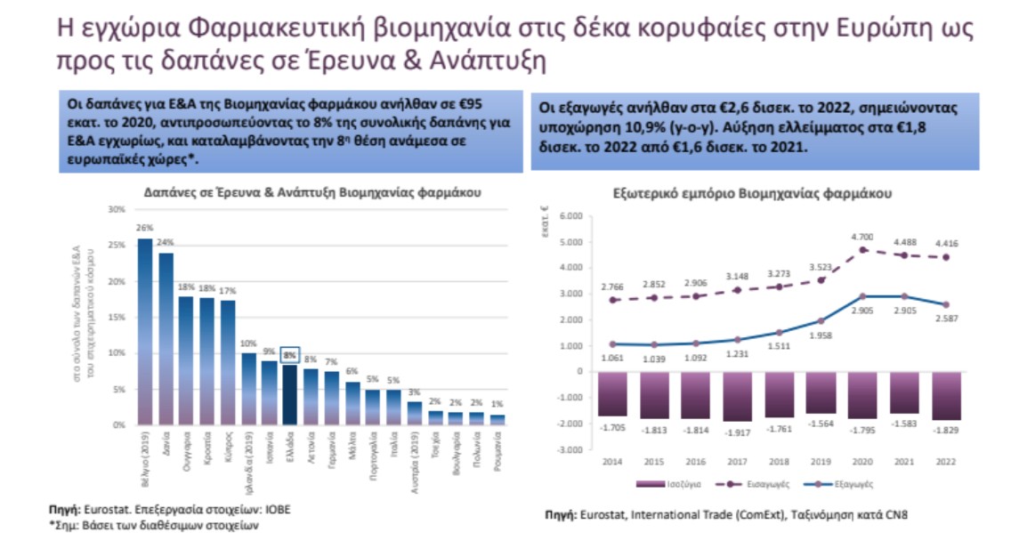 Αξίζει να σημειωθεί ότι οι δαπάνες για Έρευνα και Ανάπτυξη της βιομηχανίας φαρμάκου κινούνται γύρω στο 8% της συνολικής δαπάνης για έρευνα στη χώρα ενώ αξιοσημείωτο στοιχείο είναι η πτώση των εξαγωγών. Το 2022 υποχώρησαν στα 2,6 δισ. ευρώ, ήτοι μείωση 10,9%, με αύξηση του ελλείμματος στα 1,8 δισ. ευρώ από 1,6 δισ. ευρώ το 2021. Σημειώνεται δε το μέτρο προσωρινού χαρακτήρα του ΕΟΦ για απαγόρευση εξαγωγών φαρμάκων, στο πλαίσιο διασφάλισης της επάρκειας φαρμάκων και αντιμετώπισης των ελλείψεων.