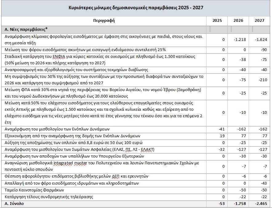 Ακόμα, σύμφωνα με το προσχέδιο του προϋπολογισμού, μειώνονται τα τεκμήρια διαβίωσης κατά 30%-35% και οι αντικειμενικές δαπάνες για αυτοκίνητα υπολογίζονται με βάση τις εκπομπές ρύπων. Θεσπίζεται ενδιάμεσος συντελεστής 25% στα μισθώματα 12.000-24.000 ευρώ, ενώ ο ΕΝΦΙΑ μειώνεται κατά 50% για κύριες κατοικίες σε οικισμούς έως 1.500 κατοίκους.