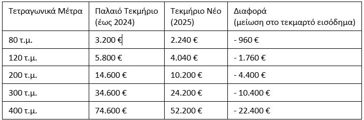 Για παράδειγμα, για μια κατοικία 80 τετραγωνικών μέτρων με τον σημερινό οριακό συντελεστή το τεκμήριο είναι 40 ευρώ ανά τετραγωνικό μέτρο, οπότε η αντικειμενική δαπάνη είναι 3.200 ευρώ. Πλέον, ο οριακός συντελεστής είναι 28 ευρώ ανά τετραγωνικό μέτρο και η αντικειμενική δαπάνη 2.240 ευρώ. Δηλαδή προκύπτει μείωση κατά 30%.