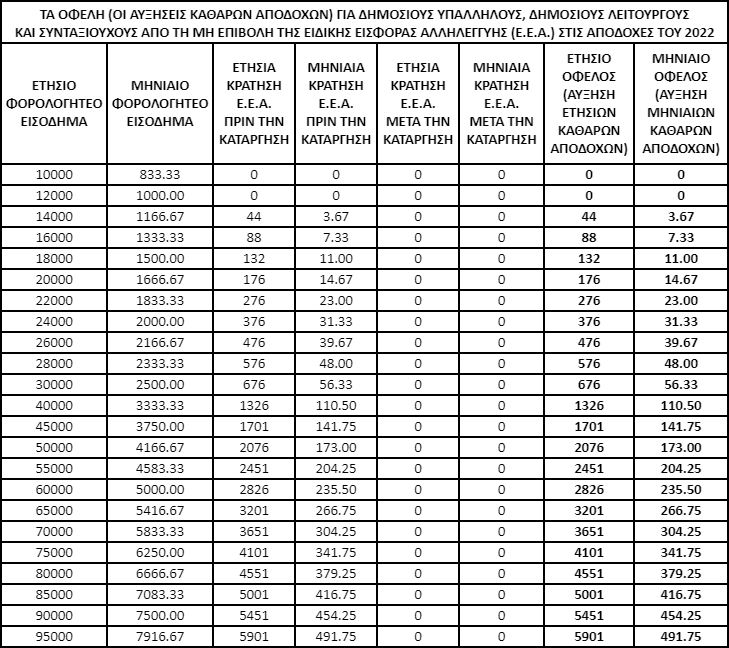 Σύμφωνα με τον αναλυτικό πίνακα παραδειγμάτων που παραθέτουμε, οι καθαρές αποδοχές των παραπάνω κατηγοριών μισθωτών υπαλλήλων και λειτουργών του δημοσίου τομέα καθώς επίσης και των παραπάνω κατηγοριών συνταξιούχων με ετήσια φορολογητέα εισοδήματα από 14.000 έως 200.000 ευρώ θα αυξηθούν κατά 44 έως 15.351 ευρώ σε ετήσια βάση ή κατά 3,67 έως 1.279,25 ευρώ σε μηνιαία βάση, αν η κυβέρνηση καταργήσει και γι’ αυτές τις κατηγορίες την ειδική εισφορά αλληλεγγύης από την 1η-1-2022.