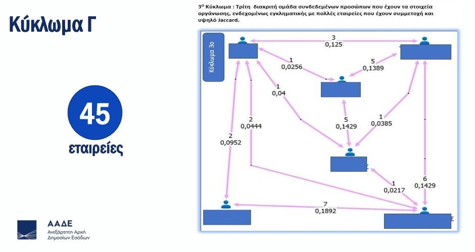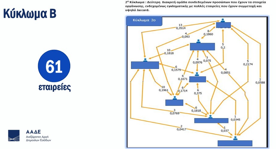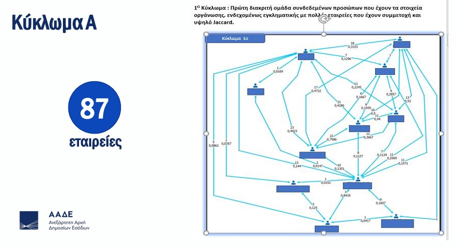 Στο πλαίσιο της ανάλυσης εξετάστηκαν στοιχεία από 380 εταιρείες, ενεργές και μη, μέσα από τα οποία εντοπίστηκαν 205 φυσικά πρόσωπα που εμφανίζονταν ως ιδιοκτήτες, μέτοχοι, εταίροι ή διαχειριστές. Οι ελεγκτικές αρχές αξιοποίησαν ειδική μεθοδολογία δυαδικών σχέσεων, καταγράφοντας πότε δύο πρόσωπα συνυπήρχαν στο ίδιο εταιρικό σχήμα. Στη συνέχεια, χρησιμοποιήθηκε ο δείκτης ομοιότητας Jaccard για να μετρηθεί η ένταση και η επικάλυψη των εταιρικών σχέσεων, επιτρέποντας τον διαχωρισμό τυχαίων συμπτώσεων από σταθερά μοτίβα συνεργασίας. Μέσω δικτυακής απεικόνισης, οι σχέσεις αυτές ομαδοποιήθηκαν σε συστάδες, αποκαλύπτοντας δομές που έμοιαζαν με οργανωμένα κυκλώματα.