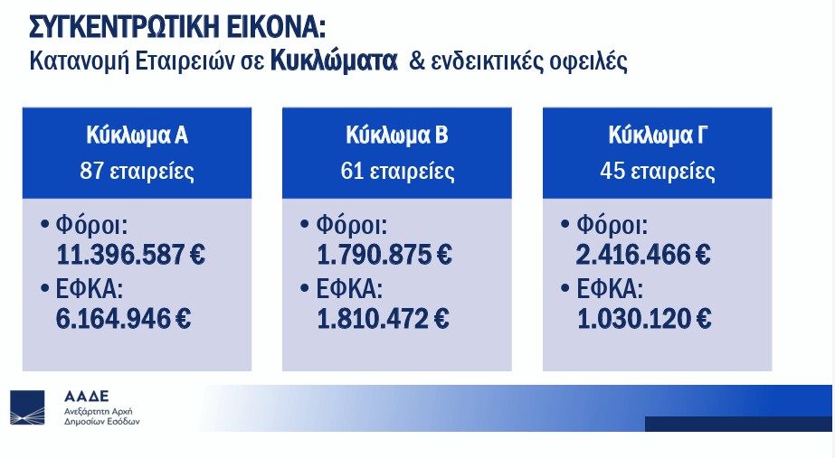 - Το τρίτο περιλάμβανε 45 εταιρείες με οφειλές άνω των 2,4 εκατ. ευρώ σε φόρους και περίπου 1 εκατ. ευρώ σε εισφορές.