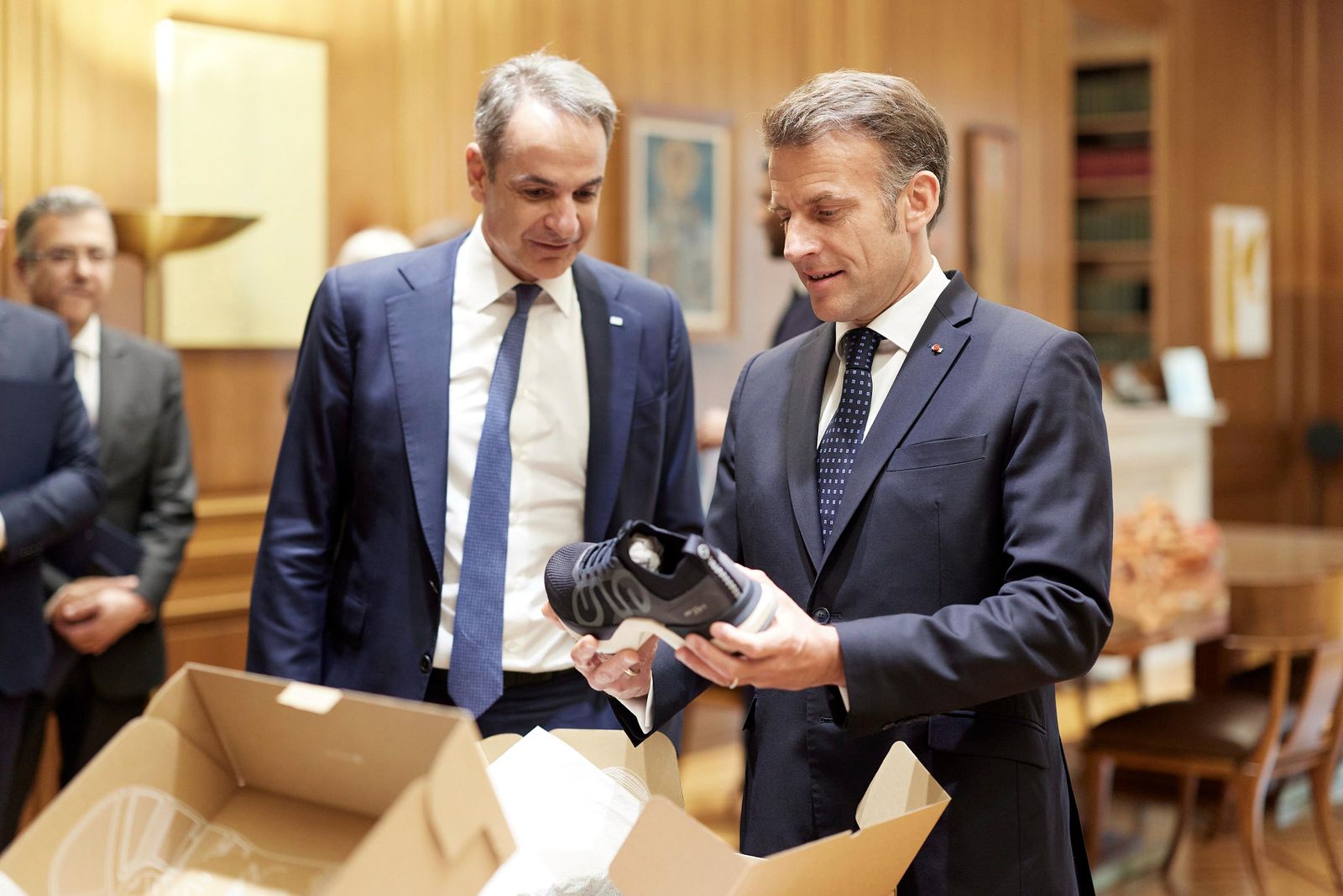 Έκπληξη πρώτου μεγέθους στο περιθώριο της συνάντησης του Κυριάκου Μητσοτάκη με τον Εμανουέλ Μακρόν στην Αθήνα. Είδαμε τον Γάλλο πρόεδρο να ανοίγει το δώρο του Κυριάκου Μητσοτάκη και να μην μπορεί να κρύψει τον ενθουσιασμό του με το περιεχόμενο. Τα αθλητικά παπούτσια της Ena Athletics εντυπωσίασαν τον Μακρόν, μια και δεν γνώριζε ότι ένα ελληνικό brand έχει κατασκευάσει τόσο προχωρημένα παπούτσια. «Εξαιρετικά!», είπε μόλις τα περιεργάστηκε λιγάκι, και άρχισε να ρωτάει γεμάτος απορία αν όντως είναι ελληνικά. Αν μη τι άλλο, ο Μητσοτάκης ήξερε πώς να κερδίσει τις εντυπώσεις με κάτι που ταίριαξε τέλεια στα γούστα του Γάλλου, καθώς είναι γνωστός για την αγάπη του για τον αθλητισμό και το τρέξιμο.