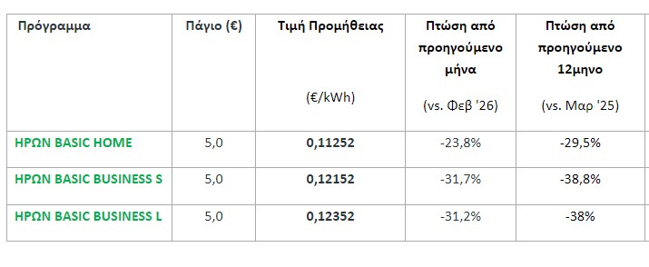 Ο νέες τιμές του ΗΡΩΝ για το «πράσινο τιμολόγιο» του Μαρτίου 2026, σημειώνουν κατακόρυφη πτώση σε σχέση με τον προηγούμενο μήνα και το περασμένο έτος, τόσο στο οικιακό όσο και στα επαγγελματικά προγράμματα και έχουν ως εξής: