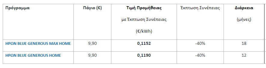 Επίσης, εξίσου ανταγωνιστικές είναι οι τιμές των σταθερών οικιακών προγραμμάτων HΡΩΝ ΒLUE GENEROUS, με το 18μηνο συμβόλαιο ΗΡΩΝ BLUE GENEROUS MAX να εξασφαλίζει χαμηλή & σταθερή τιμή ως και το επόμενο καλοκαίρι. Αναλυτικά: