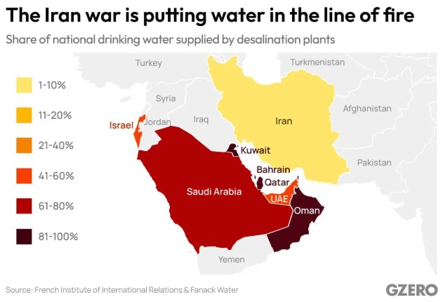 Καθώς πύραυλοι εκτοξεύονται και οι τιμές του πετρελαίου εκτινάσσονται, ο πόλεμος με το Ιράν αποκαλύπτει μια ακόμη μεγάλη ευαλωτότητα όσον αφορά στους πόρους στη Μέση Ανατολή: το νερό. Όπως αναφέρει το Gzero Media, το γλυκό νερό αποτελεί εδώ και καιρό σπάνιο αγαθό σε μια περιοχή που χαρακτηρίζεται από ξηρό κλίμα και περιορισμένες βροχοπτώσεις, όμως οι επιθέσεις σε μονάδες αφαλάτωσης της περιοχής, οι οποίες μετατρέπουν το θαλασσινό νερό σε πόσιμο, απειλούν να εντείνουν κι άλλο το σοβαρό αυτό πρόβλημα.