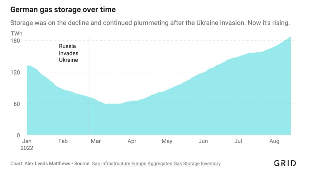 Έπειτα από μήνες μείωσης, τα αποθέματα στις αποθήκες φυσικού αερίου της Γερμανίας γεμίζουν και πάλι. Πηγή: Grid, Gas Infrastructure Europe Aggregated Gas Storage Inventory
