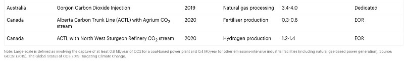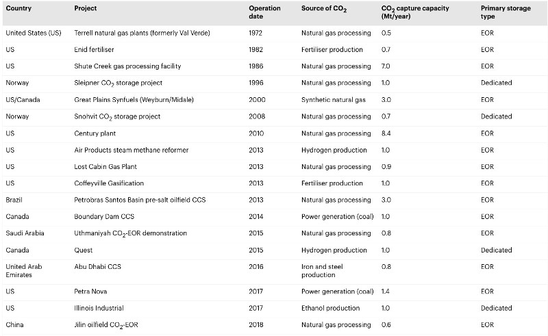 Σύμφωνα με τον Διεθνή Οργανισμό Ενέργειας ΙΕΑ, η χρήση της τεχνολογίας ξεκίνησε και κυρίως συγκεντρώνεται στις ΗΠΑ, όπου βρίσκονται οι μισές από τις υπάρχουσες δομές αυτή τη στιγμή παγκοσμίως. Κάποιες από τις υποδομές αυτές είχαν δημιουργηθεί στη δεκαετία του 1970 και του 1980, όταν οι μονάδες επεξεργασίας φυσικού αερίου στο Βαλ Βέρντε του Τέξας, δέσμευαν τις εκπομπές διοξειδίου του άνθρακα και τις παρείχαν σε τοπικούς πετρελαιοπαραγωγούς για να «αναζωογονήσουν» την παραγωγή πετρελαίου, στα πλαίσια της λεγόμενης τεχνολογίας ανάκτησης στρωματοποιημένου πετρελαίου σε πετρελαιοπηγές (ΕΟR). Από τις 21 δομές CCUS (δέσμευση, αποθήκευση και χρήση διοξειδίου του άνθρακα) που καταγράφει ο ΙΕΑ και οι οποίες δεσμεύουν περί τους 40 μεγατόνους Co2 ετησίως, κάποιες -οι περισσότερες- στοχεύουν στην επαναχρησιμοποίηση (ΕΟR), ενώ άλλες στην καθαρή αποθήκευση (dedicated), όπως αναγράφονται και στον παρακάτω πίνακα: