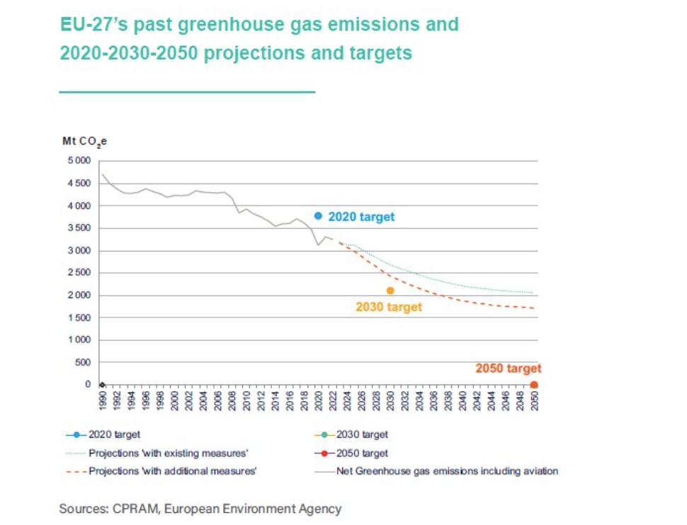 «Πίσω» στους στόχους της για περιορισμό των εκπομπών του φαινομένου του θερμοκηπίου (που ετέθησαν στο πνεύμα της Συμφωνίας του Παρισιού για το Κλίμα του ΟΗΕ το 2015) βρίσκεται η ΕΕ. Όπως επισημαίνει ανάλυση της CPR Asset Management (CPRAM), που βασίζεται σε στοιχεία του Ευρωπαϊκού Οργανισμού Περιβάλλοντος (EEA), παρότι το 2020 η Ευρώπη έπιασε τον στόχο της μείωσης κατά 30% των εκπομπών σε σχέση με τα επίπεδα του 1990 (φτάνοντας μάλιστα στο -31%), αυτό συνέβη εξαιτίας του περιορισμού της οικονομικής δραστηριότητας λόγω covid. Αντίθετα, οι μελλοντικοί στόχοι δείχνουν περισσότερο άπιαστοι.