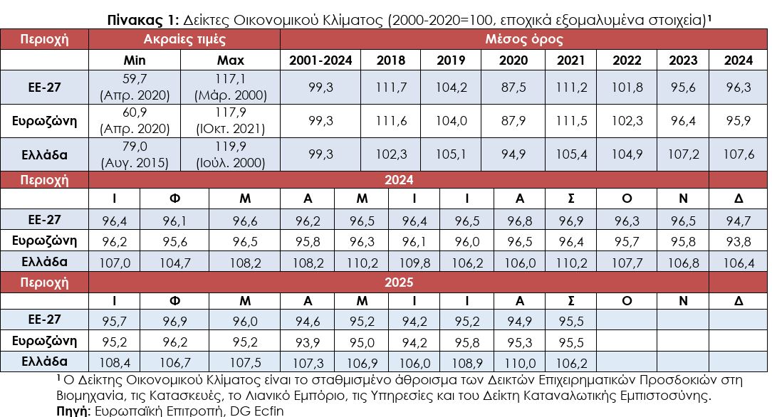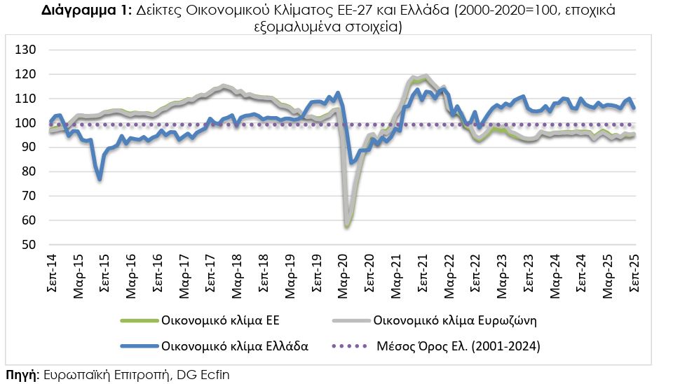 Ο δείκτης οικονομικού κλίματος στην Ελλάδα παρουσίασε μικρή επιδείνωση τον Σεπτέμβριο, υποχωρώντας στις 106,2 μονάδες από 108,9 τον Ιούλιο, κυρίως λόγω της εξασθένισης των προσδοκιών σε Βιομηχανία, Κατασκευές και Υπηρεσίες, ενώ η καταναλωτική εμπιστοσύνη εμφανίζει ήπια βελτίωση, σύμφωνα με την έρευνα οικονομικής συγκυρίας του ΙΟΒΕ. Σε ευρωπαϊκό επίπεδο, η εικόνα είναι πιο θετική, με ενίσχυση του οικονομικού κλίματος τόσο στην ΕΕ όσο και στην Ευρωζώνη, κυρίως χάρη στις βελτιωμένες προσδοκίες στη Βιομηχανία, τις Υπηρεσίες και την καταναλωτική εμπιστοσύνη.