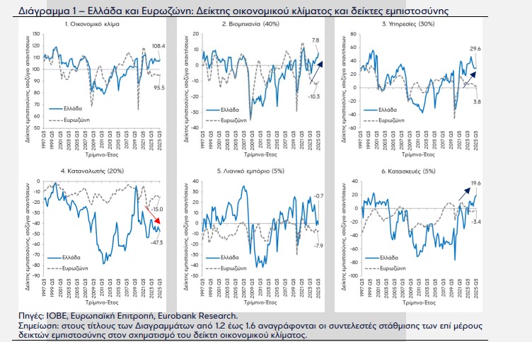 Συνοψίζοντας, αναφέρουν οι αναλυτές της Eurobank, ο δείκτης οικονομικού κλίματος στην Ελλάδα, παρά την επιδείνωσή του τον Σεπ-25, βελτιώθηκε το γ’ τρίμηνο 2025, υπερκαλύπτοντας τις απώλειες του προηγούμενου τριμήνου. Σε αυτό το αποτέλεσμα συνέβαλαν οι δείκτες εμπιστοσύνης της βιομηχανίας και των κατασκευών. Παρά ταύτα, ο δείκτης καταναλωτικής εμπιστοσύνης παρέμεινε έντονα αρνητικός (περισσότερες αρνητικές απαντήσεις στα ερωτήματα της έρευνας απ’ ό,τι θετικές) και αρκετά χαμηλότερος σε σύγκριση με την Ευρωζώνη. Ενώ σε όρους δείκτη οικονομικού κλίματος, δεικτών εμπιστοσύνης βιομηχανίας, υπηρεσιών, λιανικού εμπορίου και κατασκευών, η ελληνική οικονομία υπεραποδίδει έναντι της Ευρωζώνης, σε όρους καταναλωτικής εμπιστοσύνης υπολείπεται σημαντικά. Σε αυτό το ποιοτικό χαρακτηριστικό συμβάλει σε έναν βαθμό και η κληρονομιά της πολυετούς κρίσης χρέους.