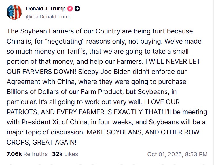 «Οι αγρότες σόγιας της χώρας μας πλήττονται επειδή η Κίνα, για λόγους ”διαπραγμάτευσης” μόνο, δεν αγοράζει», έγραψε ο Τραμπ στο Truth Social την Τετάρτη. Είπε επίσης ότι η σόγια θα είναι βασικό θέμα στη συνάντησή του με τον πρόεδρο Σι Τζινπίνγκ σε τέσσερις εβδομάδες.
