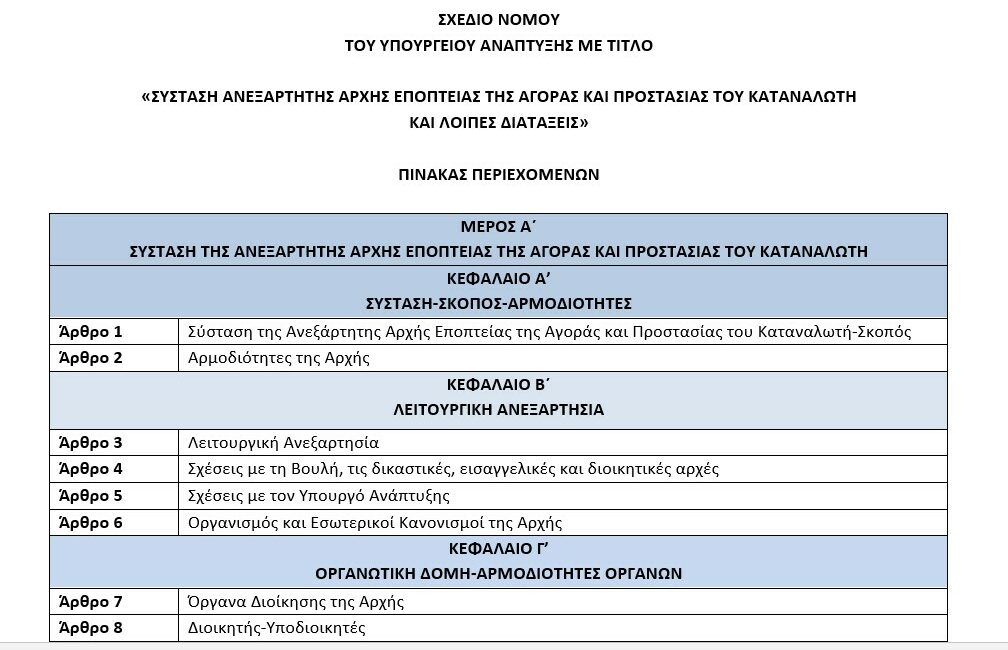 Σύμφωνα με το σχέδιο νόμου (Σ/Ν), η νέα αρχή θα ονομάζεται Ανεξάρτητη Αρχή Εποπτείας της Αγοράς και Προστασίας του Καταναλωτή (ΑΕΑΠΚ). Η αρχή θα συσταθεί ασκώντας τις αρμοδιότητες: