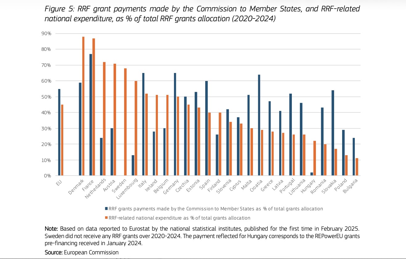 «Με λιγότερο από έναν χρόνο να απομένει μέχρι την προθεσμία του Αυγούστου 2026, η αποτελεσματική εφαρμογή μεταρρυθμίσεων και επενδύσεων από τα κράτη-μέλη καθίσταται ολοένα και πιο επείγουσα», αναφέρει η σχετική έκθεση. Όπως σημειώνεται, τρία κράτη-μέλη είναι πολύ καθυστερημένα (Βουλγαρία, Ουγγαρία και Ρουμανία), έχοντας υλοποιήσει λιγότερο από το 15% των οροσήμων, ενώ άλλα 12 κράτη-μέλη, μεταξύ των οποίων η Ελλάδα, έχουν υλοποιήσει το 15% έως 50% των οροσήμων των προγραμμάτων τους.