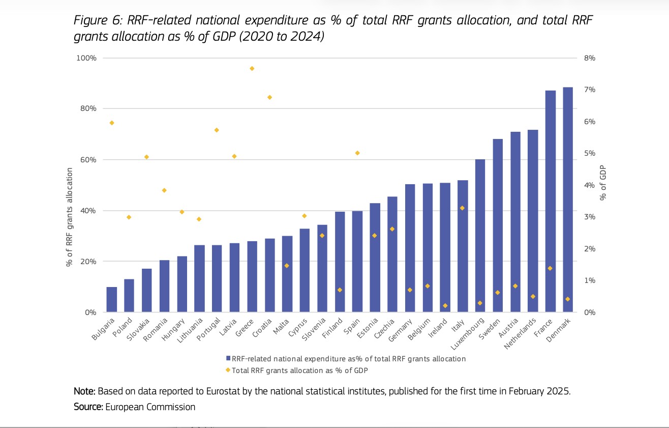 Πάντως, φαίνεται ότι ολόκληρο το ευρωπαϊκό RRF είναι οπισθοβαρές, αφού, όπως αναφέρει η σχετική έκθεση, μέχρι το α’ εξάμηνο του 2026 εκτιμάται σε όλη την Ενωμένη Ευρώπη να έχει υλοποιήσει το 60% των στόχων και οροσήμων της. Θα απομένει δηλαδή η υλοποίηση του 40% των στόχων και των οροσήμων μέσα στο τελευταίο πεντάμηνο της περιόδου υλοποίησης των εθνικών τους προγραμμάτων. Δεν αποκλείεται δε, να χαθούν πολλά χρήματα, όχι μόνον από την Ελλάδα, αλλά και από άλλες χώρες.