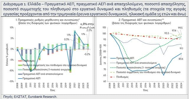 - Η παραγωγικότητα της εργασίας και οι δημογραφικές τάσεις αποτελούν αγκάθια για την ελληνική οικονομία. Αθροιστικά εξηγούν άνω του 80% της απόκλισης του πραγματικού ΑΕΠ το 2024 σε σύγκριση με την κορυφή του 2008. Συνεπώς, στην ερώτηση γιατί το πραγματικό ΑΕΠ στην Ελλάδα υπολείπεται κατά 15,1% σε σύγκριση με την κορυφή του 2008 (16,4% βάσει της διαφοράς των φυσικών λογαρίθμων) η απάντηση που δίνεται είναι ότι το προϊόν που παράγει ο μέσος απασχολούμενος στην Ελλάδα είναι αρκετά μικρότερο σε σύγκριση με τα προ κρίσης χρέους επίπεδα (π.χ. λόγω μείωσης του φυσικού κεφαλαίου ανά απασχολούμενο και της υψηλής μακροχρόνιας ανεργίας των προηγούμενων ετών), ενώ και ο πληθυσμός έχει συρρικνωθεί, μειώνοντας τους διαθέσιμους πόρους προς τις δεξαμενές του εργατικού δυναμικού και της απασχόλησης.