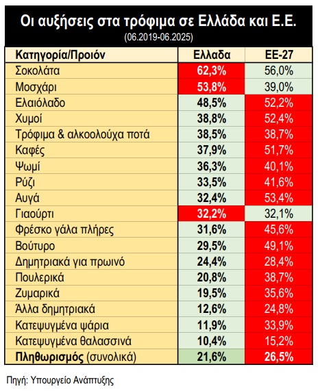 Η εικόνα του πληθωρισμού στην Ελλάδα εν συγκρίσει με την Ευρωπαϊκή Ένωση, στα τρόφιμα και σε άλλα βασικά αγαθά