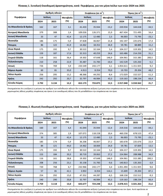 Οι εκδοθείσες άδειες Ιδιωτικής Οικοδομικής Δραστηριότητας, στο σύνολο της Χώρας, κατά τον μήνα Ιούλιο 2025 ανήλθαν σε3.118 οικοδομικές άδειες, που αντιστοιχούν σε 724.248 m2 επιφάνειας και 3.501.263 m3 όγκου, παρουσιάζοντας αύξηση κατά 13,0% στον αριθμό των οικοδομικών αδειών, αύξηση κατά 12,5% στην επιφάνεια και αύξηση κατά 21,6% στον όγκο, σε σχέση με τον αντίστοιχο μήνα του 2024. Οι εκδοθείσες άδειες Δημόσιας Οικοδομικής Δραστηριότητας κατά τον μήνα Ιούλιο 2025, στο σύνολο της Χώρας, ανήλθαν σε 16 οικοδομικές άδειες, που αντιστοιχούν σε 9.627 m2 επιφάνειας και 49.299 m3 όγκου. Το ποσοστό συμμετοχής της Δημόσιας Οικοδομικής Δραστηριότητας στον συνολικό οικοδομικό όγκο, για τον μήνα Ιούλιο 2025, είναι 1,4%.