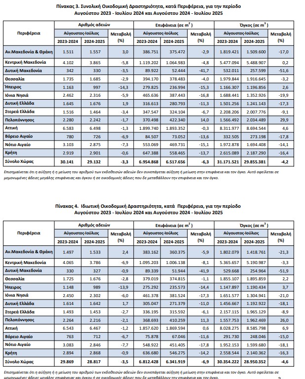 Κατά την ίδια χρονική περίοδο, Αυγούστου 2024 – Ιουλίου 2025, η Ιδιωτική Οικοδομική Δραστηριότητα, εμφανίζει στο σύνολο της Χώρας, μείωση κατά 3,5% στον αριθμό των εκδοθεισών οικοδομικών αδειών, μείωση κατά 6,9% στην επιφάνεια και μείωση κατά 4,6% στον όγκο, σε σύγκριση με την αντίστοιχη περίοδο Αυγούστου 2023 – Ιουλίου 2024. Το ποσοστό συμμετοχής της Δημόσιας Οικοδομικής Δραστηριότητας στον συνολικό οικοδομικό όγκο, για την ανωτέρω περίοδο, είναι 3%. Το επτάμηνο Ιανουαρίου – Ιουλίου 2025, η Συνολική Οικοδομική Δραστηριότητα εμφανίζει, στο σύνολο της Χώρας, μείωση κατά 9,9% στον αριθμό των οικοδομικών αδειών, μείωση κατά 18,2% στην επιφάνεια και μείωση κατά 11,8% στον όγκο, σε σχέση με το αντίστοιχο επτάμηνο του έτους 2024. Κατά την ίδια περίοδο Ιανουαρίου – Ιουλίου 2025, η Ιδιωτική Οικοδομική Δραστηριότητα, εμφανίζει στο σύνολο της Χώρας, μείωση κατά 10,0% στον αριθμό των οικοδομικών αδειών, μείωση κατά 18,4% στην επιφάνεια και μείωση κατά 11,3% στον όγκο, σε σχέση με την περίοδο Ιανουαρίου – Ιουλίου 2024.