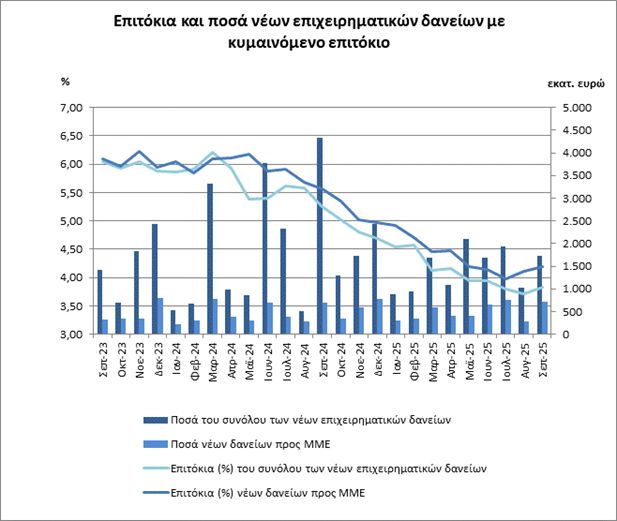 Το μέσο σταθμισμένο επιτόκιο του συνόλου των νέων δανείων προς νοικοκυριά και επιχειρήσεις αυξήθηκε κατά 6 μονάδες βάσης και διαμορφώθηκε στο 4,51%.