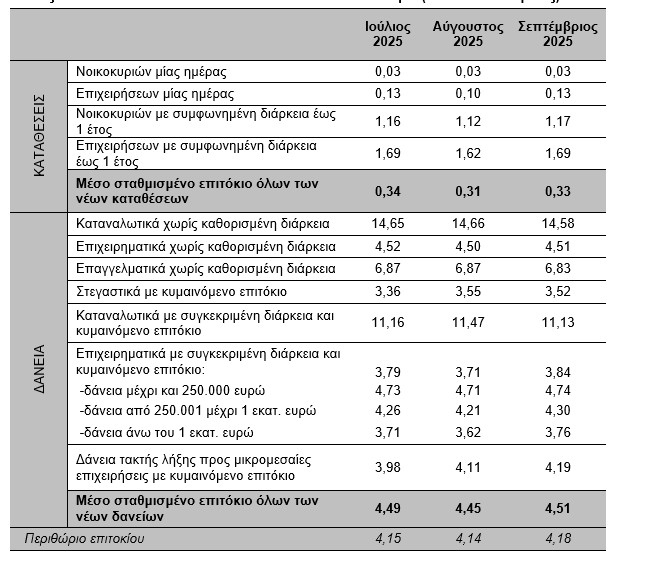 Τον Σεπτέμβριο του 2025, το μέσο σταθμισμένο επιτόκιο του συνόλου των νέων καταθέσεων παρέμεινε σχεδόν αμετάβλητο, σε σχέση με τον προηγούμενο μήνα, και διαμορφώθηκε στο 0,33%.