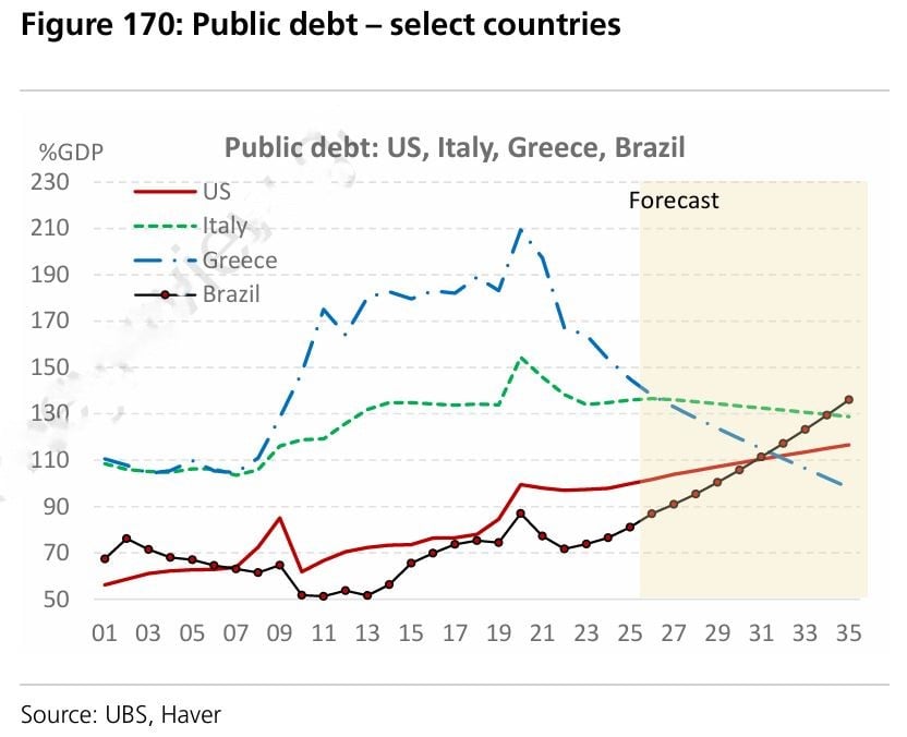 Η UBS, στην έκθεσή της για τις οικονομικές προοπτικές της περιόδου 2026-2027, επισημαίνει ότι η Ελλάδα παρουσιάζει την καλύτερη δυναμική χρέους απ’ όλες τις χώρες που παρακολουθεί διεθνώς. Και εξηγεί ότι παρόλο που το ελληνικό δημόσιο χρέος παραμένει υψηλό, μειώνεται με ταχύτερο ρυθμό από κάθε άλλη οικονομία. Σημειώνεται ότι παρόλο που η UBS δεν προβλέπει επιστροφή της Ελλάδας σε ελλείμματα έως το 2027, δίνει ιδιαίτερη έμφαση στις επόμενες εθνικές εκλογές, χωρίς να αποκλείει ότι είναι πιθανό να μπει τέλος στην αυτοδυναμία των κυβερνήσεων, που παρατηρείται τα τελευταία 8 χρόνια.