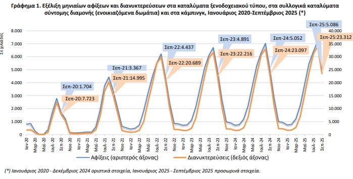 Κατά τον Σεπτέμβριο 2025 οι αφίξεις στα τουριστικά καταλύματα ανήλθαν σε 5.085.544 και οι διανυκτερεύσεις σε 23.311.959, σημειώνοντας αύξηση σε σύγκριση με τον αντίστοιχο μήνα του έτους 2024, κατά 0,7% στις αφίξεις και 0,9% στις διανυκτερεύσεις.