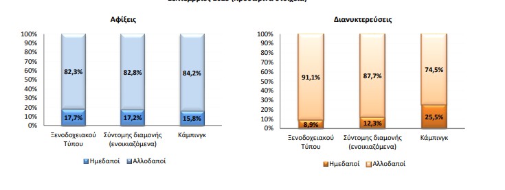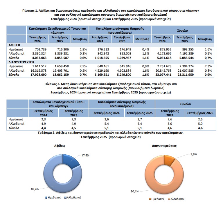 Ειδικότερα, κατά τον μήνα Σεπτέμβριο 2025 σε σύγκριση με τον αντίστοιχο μήνα του 2024, παρατηρήθηκε αύξηση 0,5% στις αφίξεις και 0,8% στις διανυκτερεύσεις των αλλοδαπών. Αντίστοιχα για τους ημεδαπούς, παρατηρήθηκε αύξηση στις αφίξεις και στις διανυκτερεύσεις κατά 1,6% και 2,3%, αντίστοιχα. Μεγαλύτερη συμβολή στις αφίξεις και στις διανυκτερεύσεις στο σύνολο των καταλυμάτων, παρατηρήθηκε από τους αλλοδαπούς με 82,4% και 90,1%, αντίστοιχα. Η μέση συνολική διανυκτέρευση για το μήνα Σεπτέμβριο 2025, ανήλθε σε 4,6 ημέρες.