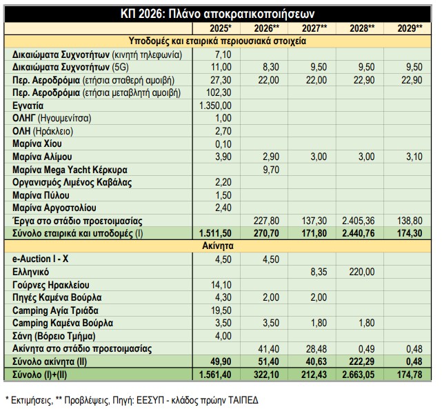 Συνολικά έσοδα 322,1 εκατ. ευρώ από αποκρατικοποιήσεις προβλέπει ο Κρατικός Προϋπολογισμός για το 2026 (ΚΠ 2026). Το μεγαλύτερο μέρος των εσόδων αφορά αποκρατικοποιήσεις εταιρικών περιουσιακών στοιχείων και υποδομών τα περισσότερα εκ των οποίων δεν κατονομάζονται από το υπουργείου Εθνικής Οικονομίας. Επίσης ο ΚΠ 2026 προβλέπει έσοδα από αξιοποιήσεις ακινήτων ύψους 51,4 εκατ. ευρώ, εκ των οποίων τα 41,4 εκατ. ευρώ επίσης δεν κατονομάζονται.