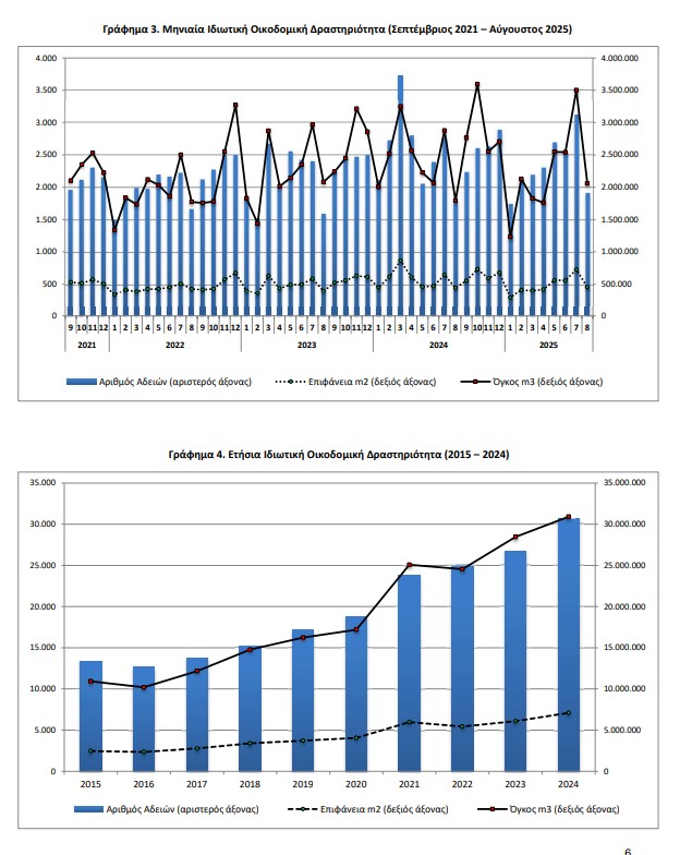 Το οκτάμηνο Ιανουαρίου – Αυγούστου 2025, η συνολική οικοδομική δραστηριότητα παρουσίασε σημαντική πτώση, με μείωση 8,4% στον αριθμό των αδειών, 16,3% στην επιφάνεια και 9,5% στον όγκο σε σχέση με το αντίστοιχο διάστημα του 2024. Η ιδιωτική οικοδομική δραστηριότητα κατέγραψε παρόμοια μείωση, ενώ η δημόσια συνέβαλε μόνο σε μικρό ποσοστό στον συνολικό οικοδομικό όγκο.