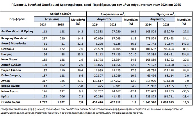 Σημαντική αύξηση σημείωσε η συνολική οικοδομική δραστηριότητα στην Ελλάδα τον Αύγουστο, ενώ στο οκτάμηνο Ιανουαρίου – Αυγούστου μειώθηκε. Τον Αύγουστο συνολικά εκδόθηκαν 1.927 άδειες, που αντιστοιχούν σε 462.812 m² επιφάνειας και 2.093.013 m³ όγκου, σημειώνοντας αύξηση 7,8% στον αριθμό των αδειών, 1,8% στην επιφάνεια και 13,3% στον όγκο σε σχέση με πέρυσι.