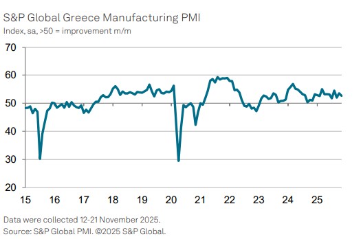 Στο 52,7 διαμορφώθηκε τον Νοέμβριο, ο εποχικά προσαρμοσμένος δείκτης S&P Global Greece Manufacturing Purchasing Managers’ Index™ (PMI) σημείωσε ελαφρά πτώση από το 53,5 του Οκτωβρίου και σηματοδότησε μια μικρή βελτίωση στις συνθήκες λειτουργίας. Η ανάπτυξη καταγράφεται στον τομέα σε σταθερή μηνιαία βάση για σχεδόν τρία χρόνια.
