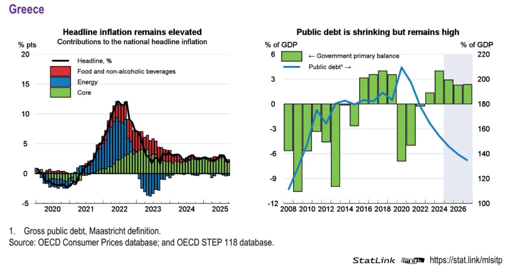 Ο ΟΟΣΑ σημειώνει ότι η ανάπτυξη παρέμεινε υψηλή το 2025, με το ΑΕΠ να ενισχύεται κατά 1,7% το δεύτερο τρίμηνο χάρη στη διεύρυνση των επενδύσεων, της κατανάλωσης και των εξαγωγών. Η απασχόληση αυξήθηκε κατά 0,6% το πρώτο εξάμηνο, ενώ οι μισθοί κατέγραψαν σημαντική άνοδο 8,7% στο δεύτερο τρίμηνο. Ο πληθωρισμός, αφού άγγιξε το 3% το τρίτο τρίμηνο, αποκλιμακώθηκε στο 1,6% τον Οκτώβριο. Η ανεργία συνέχισε να υποχωρεί, φτάνοντας στο 8,2%, ενώ οι κενές θέσεις εργασίας διατηρήθηκαν σε υψηλά επίπεδα.