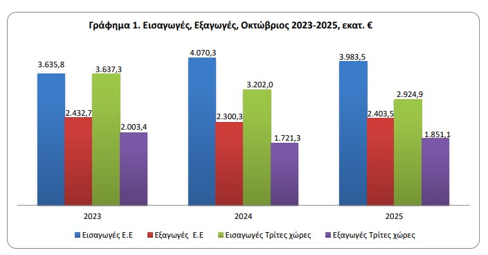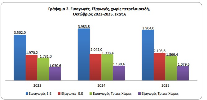 Το έλλειμμα του εμπορικού ισοζυγίου κατά τον μήνα Οκτώβριο 2025 ανήλθε σε 2.653,8 εκατ. ευρώ (3.047,4 εκατ. δολάρια) έναντι 3.250,7 εκατ. ευρώ (3.507,8 εκατ. δολάρια) κατά τον ίδιο μήνα του έτους 2024, παρουσιάζοντας μείωση, σε ευρώ, 18,4%. Η αντίστοιχη αξία χωρίς τα πετρελαιοειδή κατά τον μήνα Οκτώβριο 2025 παρουσίασε μείωση του ελλείμματος κατά 222,8 εκατ. ευρώ, δηλαδή 7,9%, ενώ η αντίστοιχη αξία χωρίς τα πετρελαιοειδή και τα πλοία κατά τον μήνα Οκτώβριο 2025 παρουσίασε μείωση κατά 240,5 εκατ. ευρώ, δηλαδή 8,6% σε σχέση με τον μήνα Οκτώβριο 2024.