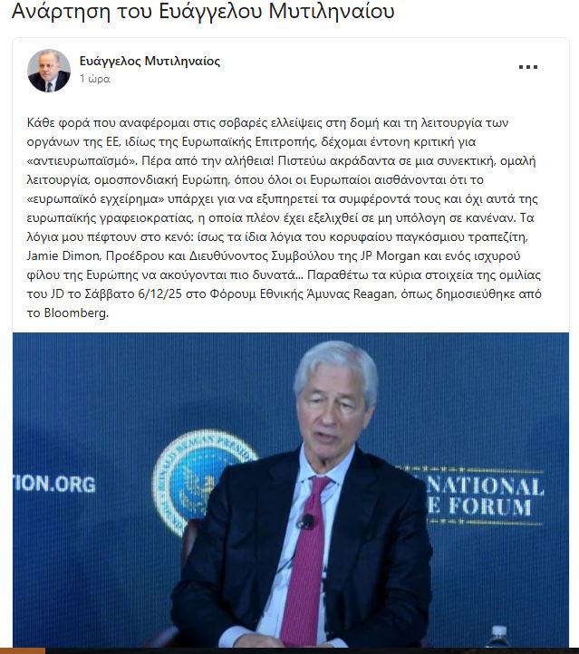 «Η ευρωπαϊκή γραφειοκρατία έφτασε σε σημείο να μην λογοδοτεί σε κανέναν», διαμηνύει, με ανάρτησή του, στο LinkedIn ο Ευάγγελος Μυτιληναίος ,που τάσσεται υπέρ της τοποθέτησης του Τζέιμι Ντάιμον. O εκτελεστικός πρόεδρος του ομίλου Metlen Energy & Metals επικαλείται τον πρόεδρο και διευθύνοντα σύμβουλο της JP Morgan, ο οποίος, σύμφωνα με τον ίδιο, εκφράζει ίδιες απόψεις.