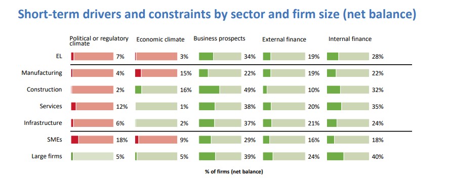 Οι ελληνικές επιχειρήσεις αναφέρουν ως κύρια εμπόδια το υψηλό κόστος ενέργειας (92%), την έλλειψη εξειδικευμένου προσωπικού (90%), την αβεβαιότητα για το μέλλον (90%) και τα διοικητικά/κανονιστικά βάρη (89%). Οι περιορισμοί στην πρόσβαση σε χρηματοδότηση επηρεάζουν το 13,5% των επιχειρήσεων, ποσοστό υψηλότερο από τον ευρωπαϊκό μέσο όρο (6,1%). Σημαντικό ποσοστό (73%) χρηματοδοτεί τις επενδύσεις του κυρίως από εσωτερικούς πόρους, ενώ το 27% επωφελείται από πολιτικές στήριξης, ποσοστό υψηλότερο από τον μέσο όρο της ΕΕ (16%).
