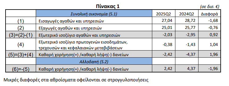 Κατά το 2ο τρίμηνο του 2025 καταγράφηκε έλλειμμα στο εξωτερικό ισοζύγιο αγαθών και υπηρεσιών 2,03 δισ. ευρώ, έναντι ελλείμματος 2,95 δισ. ευρώ που είχε καταγραφεί το 2ο τρίμηνο του 2024.