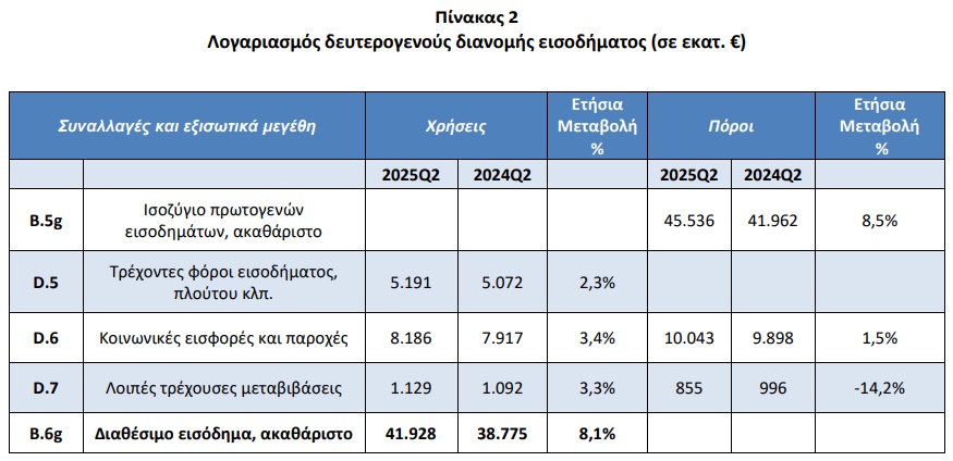 Κατά το 2ο τρίμηνο του 2025, το διαθέσιμο εισόδημα του τομέα των νοικοκυριών και των μη κερδοσκοπικών ιδρυμάτων που εξυπηρετούν νοικοκυριά (ΜΚΙΕΝ) αυξήθηκε κατά 8,1% σε σύγκριση με το αντίστοιχο τρίμηνο του προηγούμενου έτους, από 38,77 δισ. ευρώ σε 41,93 δισ. ευρώ.