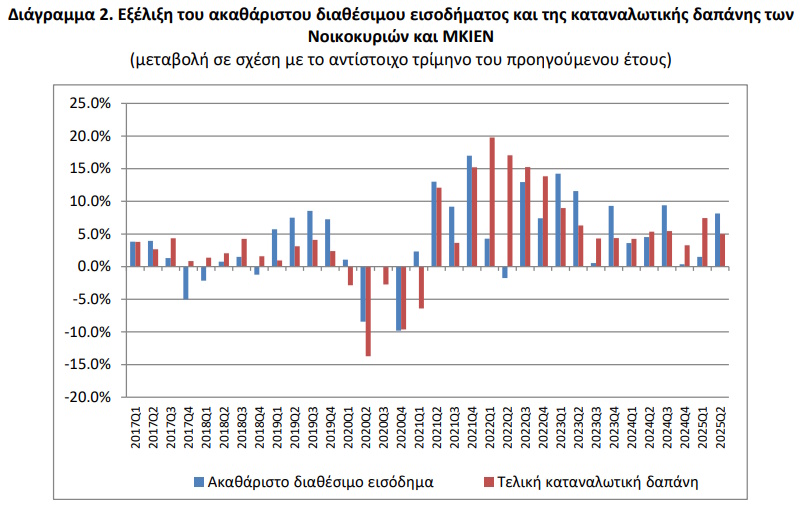 Η καταναλωτική δαπάνη των νοικοκυριών αυξήθηκε κατά 5% σε σύγκριση με το αντίστοιχο τρίμηνο του προηγούμενου έτους, από 41,1 δισ. ευρώ σε 43,2 δισ. ευρώ. Το ποσοστό αποταμίευσης ήταν -3% κατά το β’ τρίμηνο του 2025, σε σύγκριση με -6,1% το β’ τρίμηνο του 2024.
