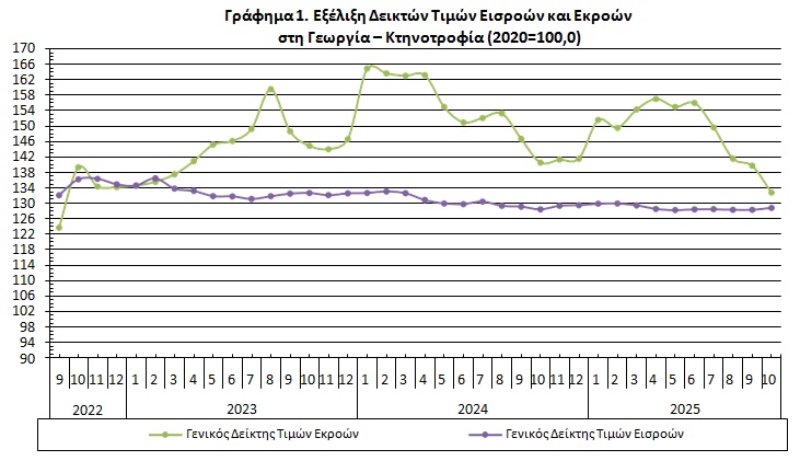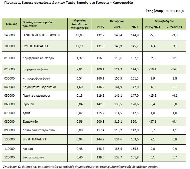 Μείωση 5,5% παρουσίασε ο Γενικός Δείκτης Τιμών Εκροών στη Γεωργία – Κτηνοτροφία (χωρίς επιδοτήσεις) του μηνός Οκτωβρίου 2025, σε σύγκριση με τον αντίστοιχο δείκτη του Οκτωβρίου 2024, σύμφωνα με την ΕΛΣΤΑΤ.