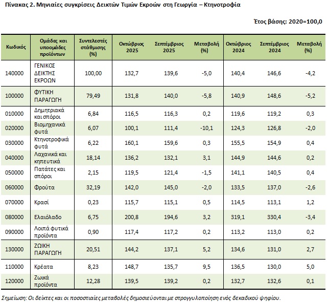 Ο Γενικός Δείκτης Τιμών Εκροών κατά τον μήνα Οκτώβριο 2025, σε σύγκριση με τον δείκτη του Σεπτεμβρίου 2025, παρουσίασε μείωση 5,0% (Πίνακας 2).