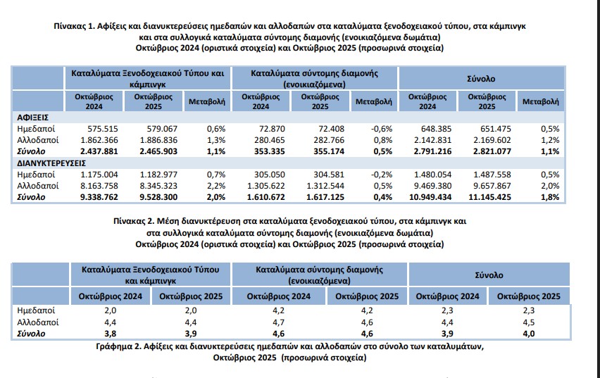 Ειδικότερα, κατά τον μήνα Οκτώβριο 2025 σε σύγκριση με τον αντίστοιχο μήνα του 2024, παρατηρήθηκε αύξηση 1,2% στις αφίξεις και 2,0% στις διανυκτερεύσεις των αλλοδαπών. Αντίστοιχα για τους ημεδαπούς, παρατηρήθηκε αύξηση τόσο στις αφίξεις όσο και στις διανυκτερεύσεις κατά 0,5%. Μεγαλύτερη συμβολή στις αφίξεις και στις διανυκτερεύσεις στο σύνολο των καταλυμάτων, παρατηρήθηκε από τους αλλοδαπούς με 76,9% και 86,7%, αντίστοιχα. Η μέση συνολική διανυκτέρευση για το μήνα Οκτώβριο 2025, ανήλθε σε 4,0