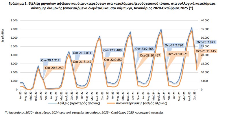 Ειδικότερα, σύμφωνα με τα στοιχεία της ΕΛΣΤΑΤ, κατά τον μήνα Οκτώβριο 2025 οι αφίξεις στα τουριστικά καταλύματα ανήλθαν σε 2.821.077 και οι διανυκτερεύσεις σε 11.145.425, σημειώνοντας αύξηση σε σύγκριση με τον αντίστοιχο μήνα του έτους 2024, κατά 1,1% στις αφίξεις και 1,8% στις διανυκτερεύσεις.