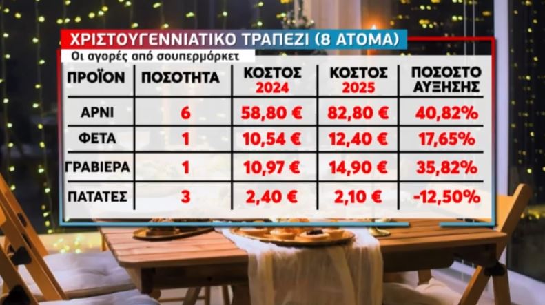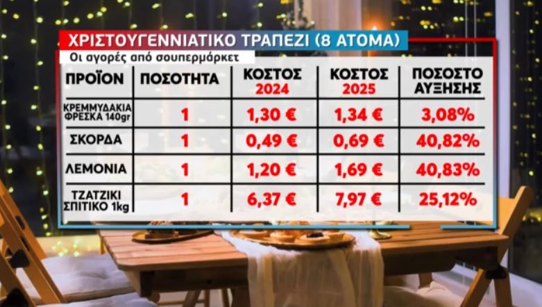 Ειδικότερα, η αύξηση αυτή αποδίδεται κυρίως στις ανατιμήσεις βασικών προϊόντων, με τις μεγαλύτερες επιβαρύνσεις να καταγράφονται σε είδη διατροφής που δεν λείπουν από το γιορτινό τραπέζι.