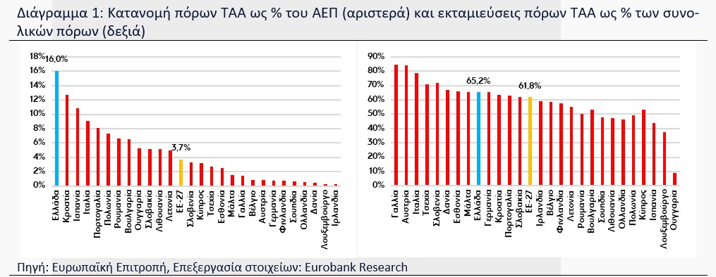 Η Ελλάδα σε σχέση με τις υπόλοιπες χώρες της ΕΕ-27 είναι αναλογικά ο μεγαλύτερος δικαιούχος πόρων από το ΤΑΑ (Διάγραμμα 1), καθώς αυτοί αντιστοιχούν στο 16,0% του ΑΕΠ της το έτος 2023 (ΕΕ-27: 3,7%), και ανέρχονται σε €35,95 δις, εκ των οποίων €18,22 δις επιχορηγήσεις και €17,73 δις δάνεια. Η παραπάνω εικόνα δεν διαφοροποιείται, τόσο στην περίπτωση των επιχορηγήσεων (Ελλάδα: 8,1% του ΑΕΠ, μέσος όρος ΕΕ-27: 2,1%) όσο και των δανείων (Ελλάδα: 7,9% του ΑΕΠ, μέσος όρος ΕΕ-27: 1,6%). Σχετικά με τις εκταμιεύσεις, μέχρι και την ημερομηνία συγγραφής του παρόντος σημειώματος (7/1/2026), είχαν εκταμιευθεί προς την Ελλάδα συνολικά €23,44 δις, δηλαδή το 65,1% των συνολικών πόρων, εκ των οποίων €12,04 δις αφορούσαν επιχορηγήσεις (το 66,1% του συνολικού ποσού αυτών) και €11,4 δις δάνεια (το 64,1% του συνολικού ποσού αυτών), κατατάσσοντας την Ελλάδα στην 9η θέση μεταξύ των χωρών της ΕΕ-27 (61,8%)[2] (Διάγραμμα 1).