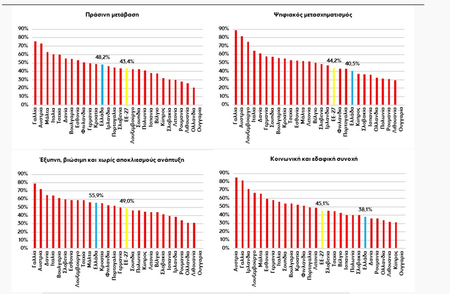 Επιπλέον, στους πυλώνες «Πράσινη μετάβαση», «Κοινωνική και εδαφική συνοχή» και «Πολιτικές για την επόμενη γενιά» μόλις 10[7], 12[8] και 12[9] χώρες αντίστοιχα έχουν ποσοστό εκπλήρωσης οροσήμων/στόχων άνω του 50%. Καλύτερη είναι η εικόνα στους πυλώνες «Ψηφιακός μετασχηματισμός» και «Έξυπνη, βιώσιμη και χωρίς αποκλεισμούς ανάπτυξη» όπου 14[10] και 15[11] χώρες αντίστοιχα έχουν ποσοστό εκπλήρωσης στόχων/οροσήμων άνω του 50%. Τέλος, στον πυλώνα «Υγεία, οικονομική, κοινωνική, θεσμική ανθεκτικότητα» παρουσιάζεται ο μεγαλύτερος αριθμός χωρών (20 από τις 27)[12] που έχουν εκπληρώσει πάνω από τα μισά ορόσημα/στόχους.