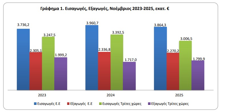Το έλλειμμα του εμπορικού ισοζυγίου κατά τον μήνα Νοέμβριο 2025 διαμορφώθηκε σε 2.800,7 εκατ. ευρώ (3.199,8 εκατ. δολάρια) έναντι 3.299,4 εκατ. ευρώ (3.471,4 εκατ. δολάρια) κατά τον ίδιο μήνα του έτους 2024, παρουσιάζοντας μείωση, σε ευρώ, 15,1%. Η αντίστοιχη αξία χωρίς τα πετρελαιοειδή κατά τον μήνα Νοέμβριο 2025 παρουσίασε μείωση του ελλείμματος κατά 73,3 εκατ. ευρώ, δηλαδή 3,0%, ενώ η αντίστοιχη αξία χωρίς τα πετρελαιοειδή και τα πλοία κατά τον μήνα Νοέμβριο 2025 παρουσίασε μείωση κατά 80,9 εκατ. ευρώ, δηλαδή 3,3% σε σχέση με τον μήνα Νοέμβριο 2024.