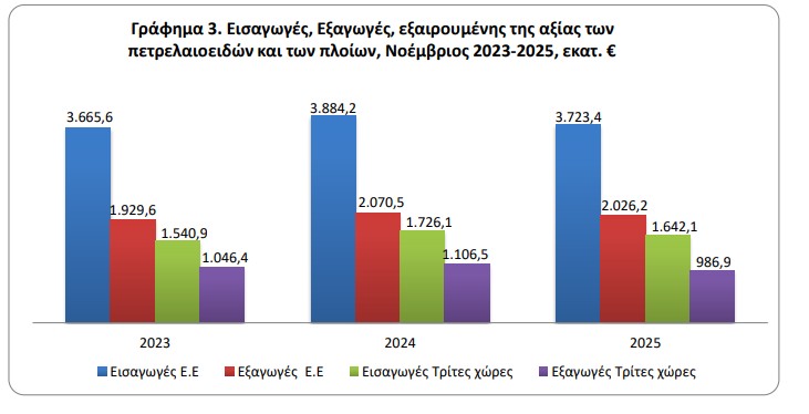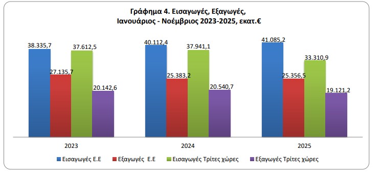 Η συνολική αξία των εξαγωγών κατά το χρονικό διάστημα Ιανουαρίου-Νοεμβρίου 2025 ανήλθε στο ποσό των 44.477,7 εκατ. ευρώ (50.215,5 εκατ. δολάρια) έναντι 45.923,9 εκατ. ευρώ (49.964,0 εκατ. δολάρια) κατά το ίδιο διάστημα του έτους 2024, παρουσιάζοντας μείωση, σε ευρώ 3,1%. Η αντίστοιχη αξία χωρίς τα πετρελαιοειδή παρουσίασε αύξηση κατά 700,3 εκατ. ευρώ, δηλαδή 2,1% και η αντίστοιχη αξία χωρίς τα πετρελαιοειδή και τα πλοία παρουσίασε αύξηση κατά 771,3 εκατ. ευρώ, δηλαδή 2,3%, σε σχέση με το χρονικό διάστημα Ιανουαρίου-Νοεμβρίου 2024. Το έλλειμμα του εμπορικού ισοζυγίου κατά το χρονικό διάστημα Ιανουαρίου-Νοεμβρίου 2025 ανήλθε σε 29.918,4 εκατ. ευρώ (33.276,1 εκατ. δολάρια) έναντι 32.129,6 εκατ. ευρώ (34.448,9 εκατ. δολάρια) κατά το ίδιο διάστημα του έτους 2024, παρουσιάζοντας μείωση, σε ευρώ, 6,9%. Το αντίστοιχο μέγεθος χωρίς τα πετρελαιοειδή παρουσίασε αύξηση κατά 268,6 εκατ. ευρώ, δηλαδή 1,0% και το αντίστοιχο μέγεθος χωρίς τα πετρελαιοειδή και τα πλοία παρουσίασε αύξηση κατά 29,0 εκατ. ευρώ, δηλαδή 0,1%.